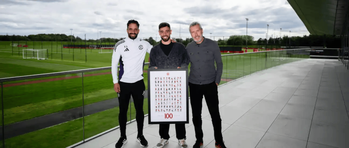 他是俱乐部辉煌历史上第23位达成这一里程碑的球员。周三下午,在卡灵顿训练基地的餐厅里,布鲁诺在队友和工作人员的见证下接过了这份礼物。