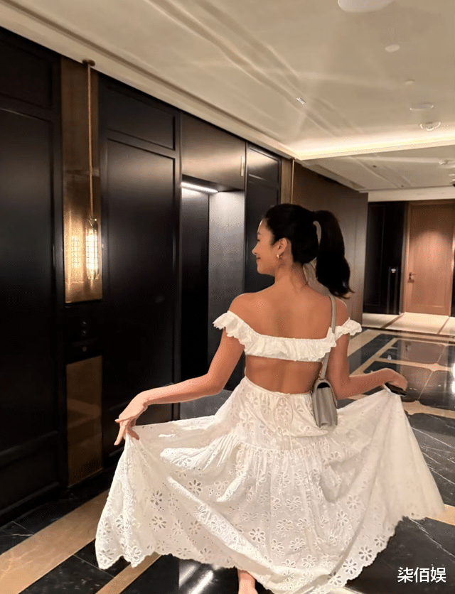 杨采钰老公还分享了一张杨采钰背影照,杨采钰拎起裙摆,满脸微笑地走在走廊里,小表情写满了幸福。