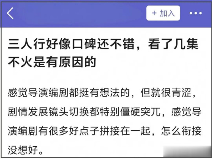 播出不到半个月时间,《三人行》已经积累了不少剧粉,虽然剧集热度一般,但如今长剧能吸引到“自来水”讨论剧情,还是挺不容易的。
