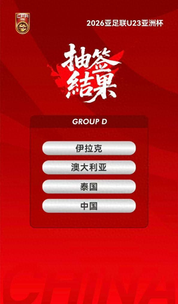 新华社北京10月2日电2日,2026年沙特阿拉伯U23男足亚洲杯抽签出炉。中国队作为第四档球队,与伊拉克队、澳大利亚队、泰国队同分在D组。 今年9月在西安举行的预选赛中,中国队与澳大利亚队0:0战平,两队携手晋级本届U23亚洲杯正赛。 根据竞赛规则,本届U23亚洲杯16支球队被分入四个小组,各小组前两名将晋级八强。其余三个小组中,东道主沙特队与越南、约旦、吉尔吉斯斯坦队被分入A组;日本、卡塔尔、阿联酋和叙利亚队被分入B组;C组则有乌兹别克斯坦、韩国、伊朗和黎巴嫩队。 本届赛事将于2026年1月...